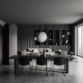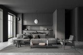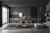 Widok z przodu na ciemne studio wnętrza pokoju z wyspy, sofa, fotele, szare ściany, panoramiczne okno, betonowa podłoga, stolik kawowy, naczynia, lampa. Koncepcja minimalistycznego designu. 3d renderowanie