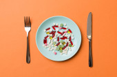 Talerz smacznych gotowanych kiełbasek na turkusowym tle
