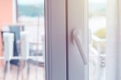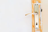 Drzwi łazienkowe z mosiężnym uchwytem vintage, ostrość selektywna