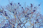 Wiosną, wiele starych butów wisi wysoko na gałęziach drzewa na tle błękitnego nieba na świeżym powietrzu, słoneczny wiosenny dzień, błękitne niebo w tle