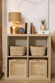 Zdjęcie "Drewniana skrzynia szuflad, lampa i piękny obraz na białej ścianie wewnątrz. Projekt wnętrza" może być wykorzystywane do celów osobistych i komercyjnych zgodnie z warunkami zakupionej licencji Royalty-free. Obraz jest dostępny do pobrania w jakości wysokiej rozdzielczości do 5760x3840.