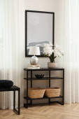 Drewniana skrzynia szuflad, lampa i piękny obraz na białej ścianie wewnątrz. Projekt wnętrza