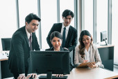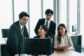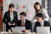 Zdjęcie "Doradcy finansowi współpracują w celu oceny wyników finansowych przedsiębiorstwa na podstawie danych pochodzących z jego działalności operacyjnej. Członkowie zespołu współpracują na spotkaniu dyskusyjnym w celu opracowania biznesplanu." może być wykorzystywane do celów osobistych i komercyjnych zgodnie z warunkami zakupionej licencji Royalty-free. Obraz jest dostępny do pobrania w jakości wysokiej rozdzielczości do 5760x3840.