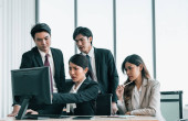 Doradcy finansowi współpracują w celu oceny wyników finansowych przedsiębiorstwa na podstawie danych pochodzących z jego działalności operacyjnej. Członkowie zespołu współpracują na spotkaniu dyskusyjnym w celu opracowania biznesplanu.