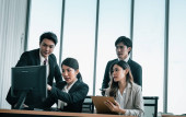 Doradcy finansowi współpracują w celu oceny wyników finansowych przedsiębiorstwa na podstawie danych pochodzących z jego działalności operacyjnej. Członkowie zespołu współpracują na spotkaniu dyskusyjnym w celu opracowania biznesplanu.