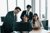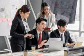 Zdjęcie "Doradcy finansowi współpracują w celu oceny wyników finansowych przedsiębiorstwa na podstawie danych pochodzących z jego działalności operacyjnej. Członkowie zespołu współpracują na spotkaniu dyskusyjnym w celu opracowania biznesplanu." może być wykorzystywane do celów osobistych i komercyjnych zgodnie z warunkami zakupionej licencji Royalty-free. Obraz jest dostępny do pobrania w jakości wysokiej rozdzielczości do 5760x3840.
