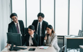 Doradcy finansowi współpracują w celu oceny wyników finansowych przedsiębiorstwa na podstawie danych pochodzących z jego działalności operacyjnej. Członkowie zespołu współpracują na spotkaniu dyskusyjnym w celu opracowania biznesplanu.