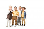 Poważne międzyrasowe dzieci w ubraniach casual mając pomysł, przytulanie i patrząc w obiektyw podczas obchodów Dnia Ochrony Dzieci na tle khaki