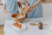 Zdjęcie "Ciekawa dziewczynka wygląda jak mama przygotowuje ciasto na ciasto, uczy się gotować, zdobywa doświadczenie kulinarne, nosi fartuch. Kobieta bez twarzy dodaje mąki w misce z innymi składnikami, pozować w kuchni z dzieckiem" może być wykorzystywane do celów osobistych i komercyjnych zgodnie z warunkami zakupionej licencji Royalty-free. Obraz jest dostępny do pobrania w jakości wysokiej rozdzielczości do 5760x3840.