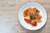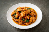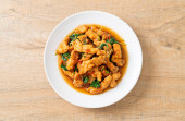 smażony chrupiący kurczak z orzechem nerkowca i cebulą w plasterkach na talerzu