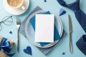 Pomysł na śniadanie z okazji Dnia Ojca. Widok z góry domowej roboty kanapki na talerzu, filiżanka kawy, sztućce, koperta z literą, pudełko na prezenty, krawat, okulary, na brązowym tle z pustym miejscem na wiadomość