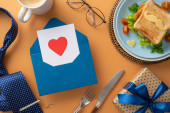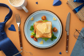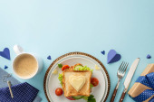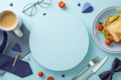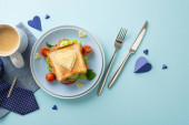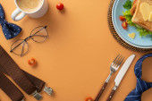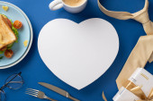 Świętuj Dzień Ojca ze śniadaniem niespodzianką dla taty! Widok góry kanapki z warzywami na talerzu, wraz z sztućcami, filiżanka kawy, i więcej, wszystko na brązowym tle z pustym sercem