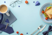 Zdjęcie "Świętuj Dzień Ojca ze śniadaniem niespodzianką dla taty! Widok góry kanapki z warzywami na talerzu, wraz z sztućcami, filiżanka kawy, i więcej, wszystko na brązowym tle z pustym sercem" może być wykorzystywane do celów osobistych i komercyjnych zgodnie z warunkami zakupionej licencji Royalty-free. Obraz jest dostępny do pobrania w jakości wysokiej rozdzielczości do 5760x3840.