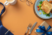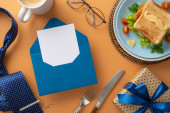 Zacznij dzień ojca od śniadaniowej niespodzianki dla taty! Górny widok kanapka, poczta w kształcie serca, kawa, akcesoria, krawat, okulary, niebieskie tło z tekstem lub przestrzeni reklamowej