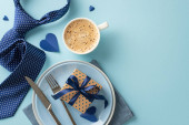 Zdjęcie "Zacznij dzień ojca od śniadaniowej niespodzianki dla taty! Górny widok kanapka, poczta w kształcie serca, kawa, akcesoria, krawat, okulary, niebieskie tło z tekstem lub przestrzeni reklamowej" może być wykorzystywane do celów osobistych i komercyjnych zgodnie z warunkami zakupionej licencji Royalty-free. Obraz jest dostępny do pobrania w jakości wysokiej rozdzielczości do 5760x3840.