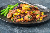 Chleb kukurydziany z jajkiem smażonym i fasolą zieloną