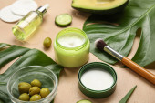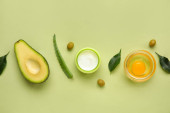Skład z naturalnych kosmetyków, awokado, oliwek i liści aloesu na tle koloru