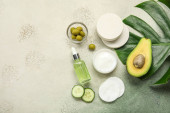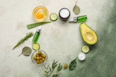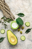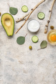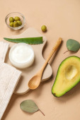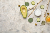 Skład z naturalnych produktów kosmetycznych, awokado, oliwki, ogórek i gałąź eukaliptusa na tle koloru