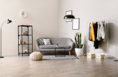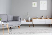 Wnętrze stylowego salonu z drewnianą szafką, regałami i fotelami