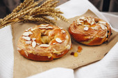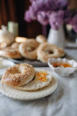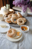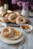 talerz bajgli z sezamem, pożywne i satysfakcjonujące śniadanie