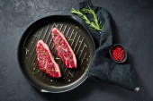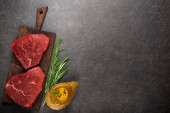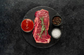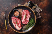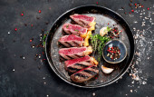 Grilled Oyster Top Blade beef meat steak on a plate with salad. Black background. Top View.