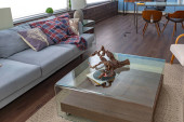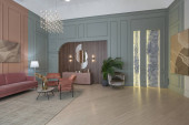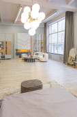 Nowoczesny modny kreatywny design gabinetu z częścią wypoczynkową w stylu minimalizmu w kolorach niebieskim i beżowym z dużymi oknami i światłem dziennym
