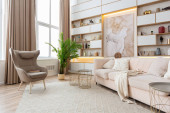 Zdjęcie "Nowoczesny modny kreatywny design gabinetu z częścią wypoczynkową w stylu minimalizmu w kolorach niebieskim i beżowym z dużymi oknami i światłem dziennym" może być wykorzystywane do celów osobistych i komercyjnych zgodnie z warunkami zakupionej licencji Royalty-free. Obraz jest dostępny do pobrania w jakości wysokiej rozdzielczości do 5760x3840.