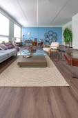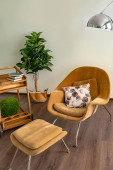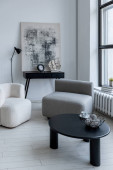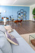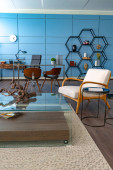 Nowoczesny modny kreatywny design gabinetu z częścią wypoczynkową w stylu minimalizmu w kolorach niebieskim i beżowym z dużymi oknami i światłem dziennym
