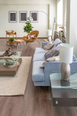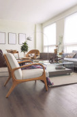 Zdjęcie "Nowoczesny modny kreatywny design gabinetu z częścią wypoczynkową w stylu minimalizmu w kolorach niebieskim i beżowym z dużymi oknami i światłem dziennym" może być wykorzystywane do celów osobistych i komercyjnych zgodnie z warunkami zakupionej licencji Royalty-free. Obraz jest dostępny do pobrania w jakości wysokiej rozdzielczości do 5760x3840.