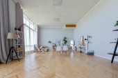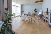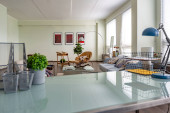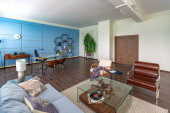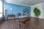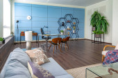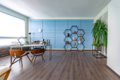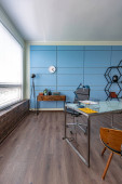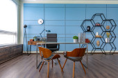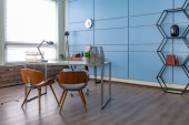 Nowoczesny modny kreatywny design gabinetu z częścią wypoczynkową w stylu minimalizmu w kolorach niebieskim i beżowym z dużymi oknami i światłem dziennym