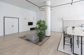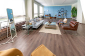 Zdjęcie "Nowoczesny modny kreatywny design gabinetu z częścią wypoczynkową w stylu minimalizmu w kolorach niebieskim i beżowym z dużymi oknami i światłem dziennym" może być wykorzystywane do celów osobistych i komercyjnych zgodnie z warunkami zakupionej licencji Royalty-free. Obraz jest dostępny do pobrania w jakości wysokiej rozdzielczości do 5760x3840.