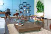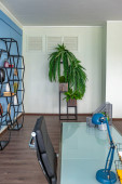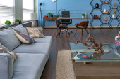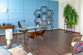 Nowoczesny modny kreatywny design gabinetu z częścią wypoczynkową w stylu minimalizmu w kolorach niebieskim i beżowym z dużymi oknami i światłem dziennym