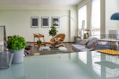Zdjęcie "Nowoczesny modny kreatywny design gabinetu z częścią wypoczynkową w stylu minimalizmu w kolorach niebieskim i beżowym z dużymi oknami i światłem dziennym" może być wykorzystywane do celów osobistych i komercyjnych zgodnie z warunkami zakupionej licencji Royalty-free. Obraz jest dostępny do pobrania w jakości wysokiej rozdzielczości do 5760x3840.