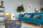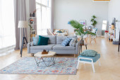 eleganckie kreatywne nowoczesne modne wnętrze przestronnego studia w stylu skandynawskim z miejscami do siedzenia i spania