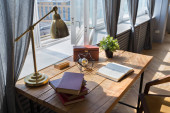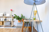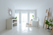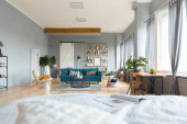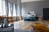 eleganckie kreatywne nowoczesne modne wnętrze przestronnego studia w stylu skandynawskim z miejscami do siedzenia i spania