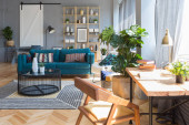 Zdjęcie "eleganckie kreatywne nowoczesne modne wnętrze przestronnego studia w stylu skandynawskim z miejscami do siedzenia i spania" może być wykorzystywane do celów osobistych i komercyjnych zgodnie z warunkami zakupionej licencji Royalty-free. Obraz jest dostępny do pobrania w jakości wysokiej rozdzielczości do 5760x3840.