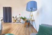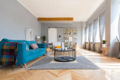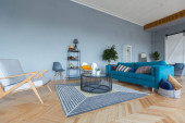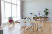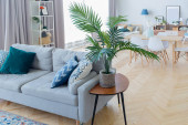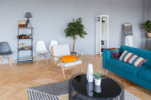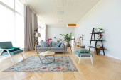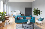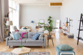 eleganckie kreatywne nowoczesne modne wnętrze przestronnego studia w stylu skandynawskim z miejscami do siedzenia i spania