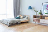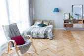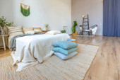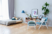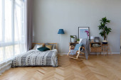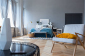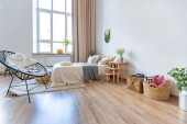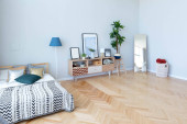 eleganckie kreatywne nowoczesne modne wnętrze przestronnego studia w stylu skandynawskim z miejscami do siedzenia i spania