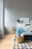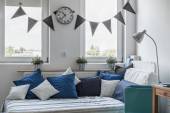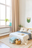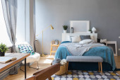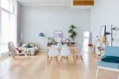 eleganckie kreatywne nowoczesne modne wnętrze przestronnego studia w stylu skandynawskim z miejscami do siedzenia i spania