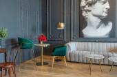 Zdjęcie "eleganckie wnętrze pokoju w renesansowym stylu XIX wieku z nowoczesnymi luksusowymi meblami. ściany szlachetnego ciemnego koloru ozdobione są sztukaterią i złoconymi ramami, drewnianym parkietem." może być wykorzystywane do celów osobistych i komercyjnych zgodnie z warunkami zakupionej licencji Royalty-free. Obraz jest dostępny do pobrania w jakości wysokiej rozdzielczości do 5760x3840.
