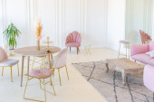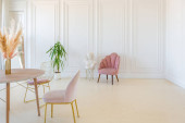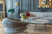 eleganckie wnętrze pokoju w renesansowym stylu XIX wieku z nowoczesnymi luksusowymi meblami. ściany szlachetnego ciemnego koloru ozdobione są sztukaterią i złoconymi ramami, drewnianym parkietem.