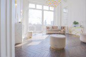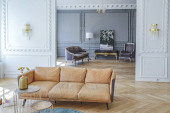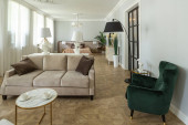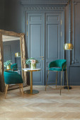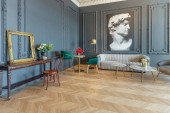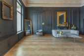eleganckie wnętrze pokoju w renesansowym stylu XIX wieku z nowoczesnymi luksusowymi meblami. ściany szlachetnego ciemnego koloru ozdobione są sztukaterią i złoconymi ramami, drewnianym parkietem.