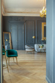 Zdjęcie "eleganckie wnętrze pokoju w renesansowym stylu XIX wieku z nowoczesnymi luksusowymi meblami. ściany szlachetnego ciemnego koloru ozdobione są sztukaterią i złoconymi ramami, drewnianym parkietem." może być wykorzystywane do celów osobistych i komercyjnych zgodnie z warunkami zakupionej licencji Royalty-free. Obraz jest dostępny do pobrania w jakości wysokiej rozdzielczości do 5760x3840.