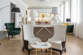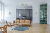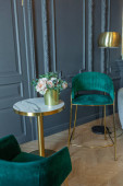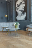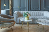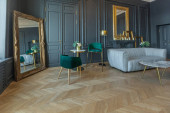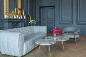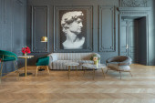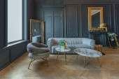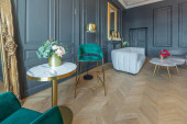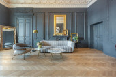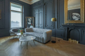 eleganckie wnętrze pokoju w renesansowym stylu XIX wieku z nowoczesnymi luksusowymi meblami. ściany szlachetnego ciemnego koloru ozdobione są sztukaterią i złoconymi ramami, drewnianym parkietem.