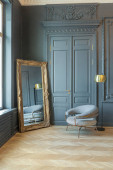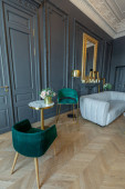 Zdjęcie "eleganckie wnętrze pokoju w renesansowym stylu XIX wieku z nowoczesnymi luksusowymi meblami. ściany szlachetnego ciemnego koloru ozdobione są sztukaterią i złoconymi ramami, drewnianym parkietem." może być wykorzystywane do celów osobistych i komercyjnych zgodnie z warunkami zakupionej licencji Royalty-free. Obraz jest dostępny do pobrania w jakości wysokiej rozdzielczości do 5760x3840.