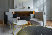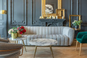eleganckie wnętrze pokoju w renesansowym stylu XIX wieku z nowoczesnymi luksusowymi meblami. ściany szlachetnego ciemnego koloru ozdobione są sztukaterią i złoconymi ramami, drewnianym parkietem.