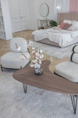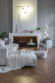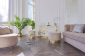 bardzo lekki barokowy styl luksusowe wnętrze dużego salonu. Białe ściany ozdobione niesamowitą sztukaterią. Apartament w stylu królewskim z eleganckimi meblami z elementami złota