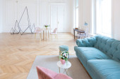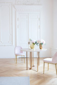 bardzo lekki barokowy styl luksusowe wnętrze dużego salonu. Białe ściany ozdobione niesamowitą sztukaterią. Apartament w stylu królewskim z eleganckimi meblami z elementami złota