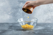 przycięty widok wytatuowanej młodej kobiety trzymającej butelkę podczas nalewania świeżego mleka do miski z płatkami kukurydzianymi i robienia śniadania stojąc w ubraniach casual jeansy w nowoczesnej kuchni, baner
