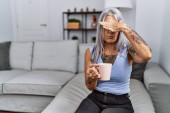 skupiona młoda kobieta z tatuażem na dłoni i grzywką trzymająca filiżankę kawy i patrząca na niewyraźny laptop w pobliżu smartfona na białym stole w nowoczesnej kuchni, freelancer, zdalny styl życia